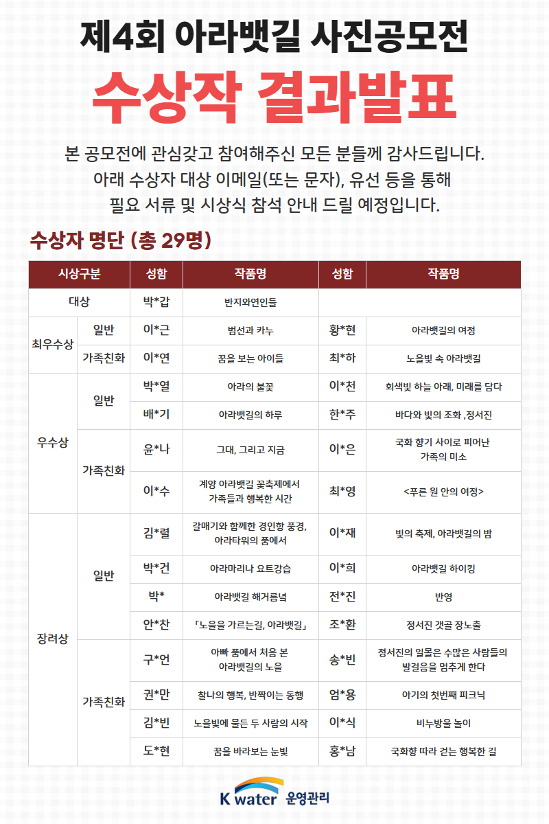 * 수상 명단은 상단 이미지 파일 확인 부탁드립니다. * 최종 수상작 온라인 전시는 수상자 대상 원본 파일 검토 완료 이후 진행될 예정입니다. * 수상하신 분들께는 금주 중 개별 연락드릴 예정입니다. * 수상자 발표 순서는 가나다순입니다.